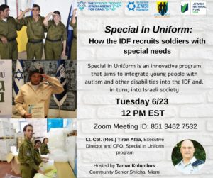 Special In Uniform – an innovative program that recruits young people with autism and other disabilities into the IDF and in turn into Israeli society. A conversation with Lt. General (Res) Tiran Attia, Executive Director and CFO of the Special in Uniform Program and Nancy Zaretsky, Inclusion Specialist, Greater Miami Jewish Federation, hosted by Tamar Kolumbus, Community Senior Shlicha Miami