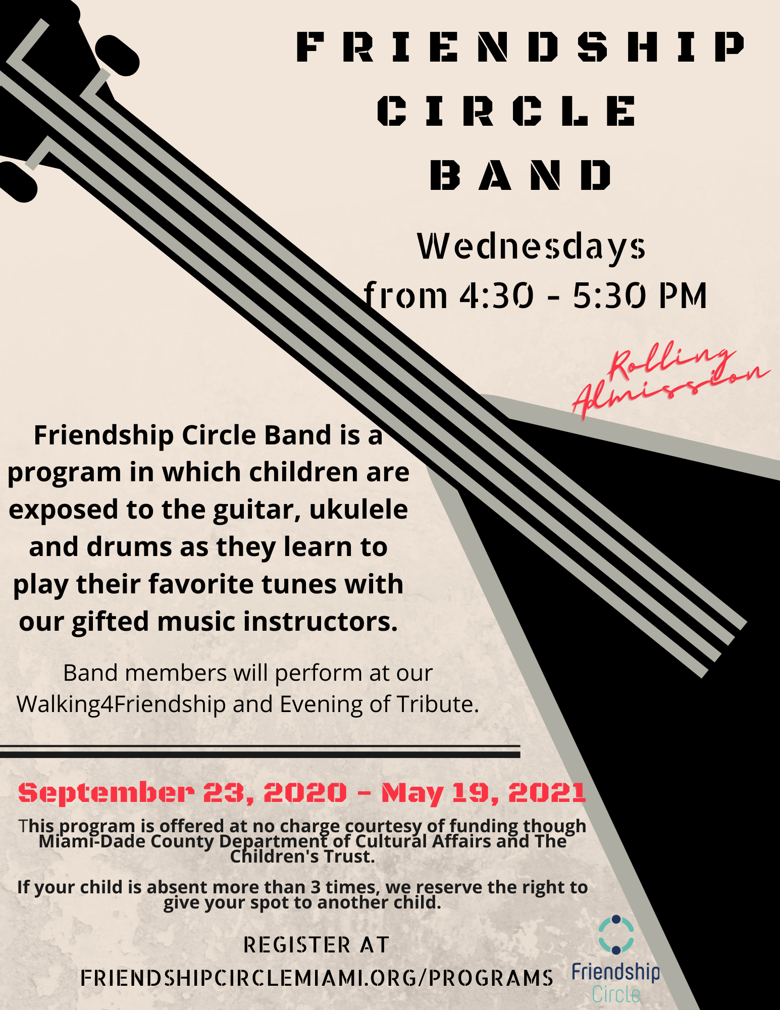 Friendship Circle Band is a program in which children are exposed to the guitar, ukulele and drums as they learn to play their favorite tunes with our gifted music instructors and volunteers. This program is offered at no charge courtesy of funding though Miami-Dade County Department of Cultural Affairs and The Children’s Trust. If your